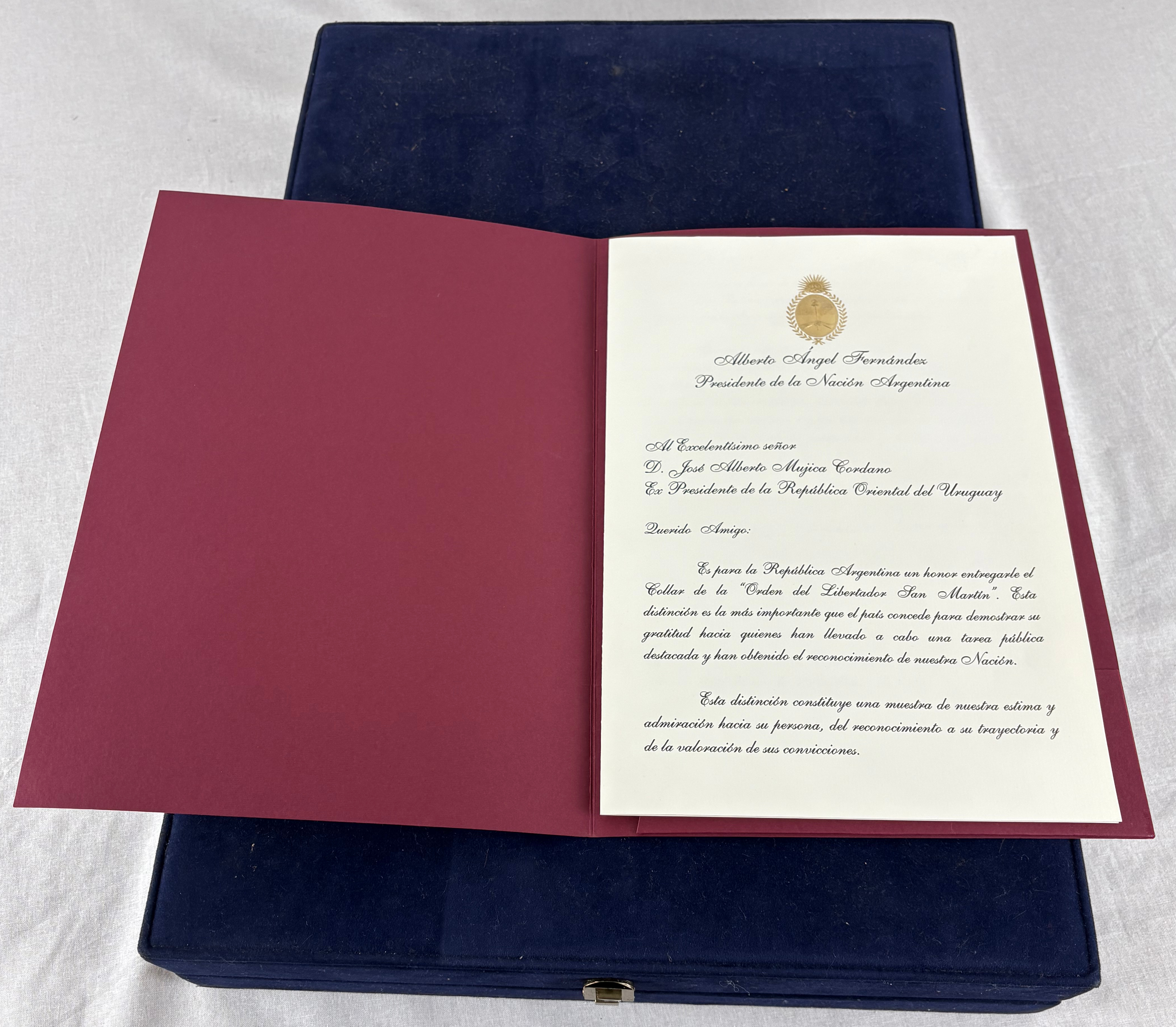 Carpetin oficial que contiene una carta con la firma original del Presidente de la Nación, Alberto Fernández.