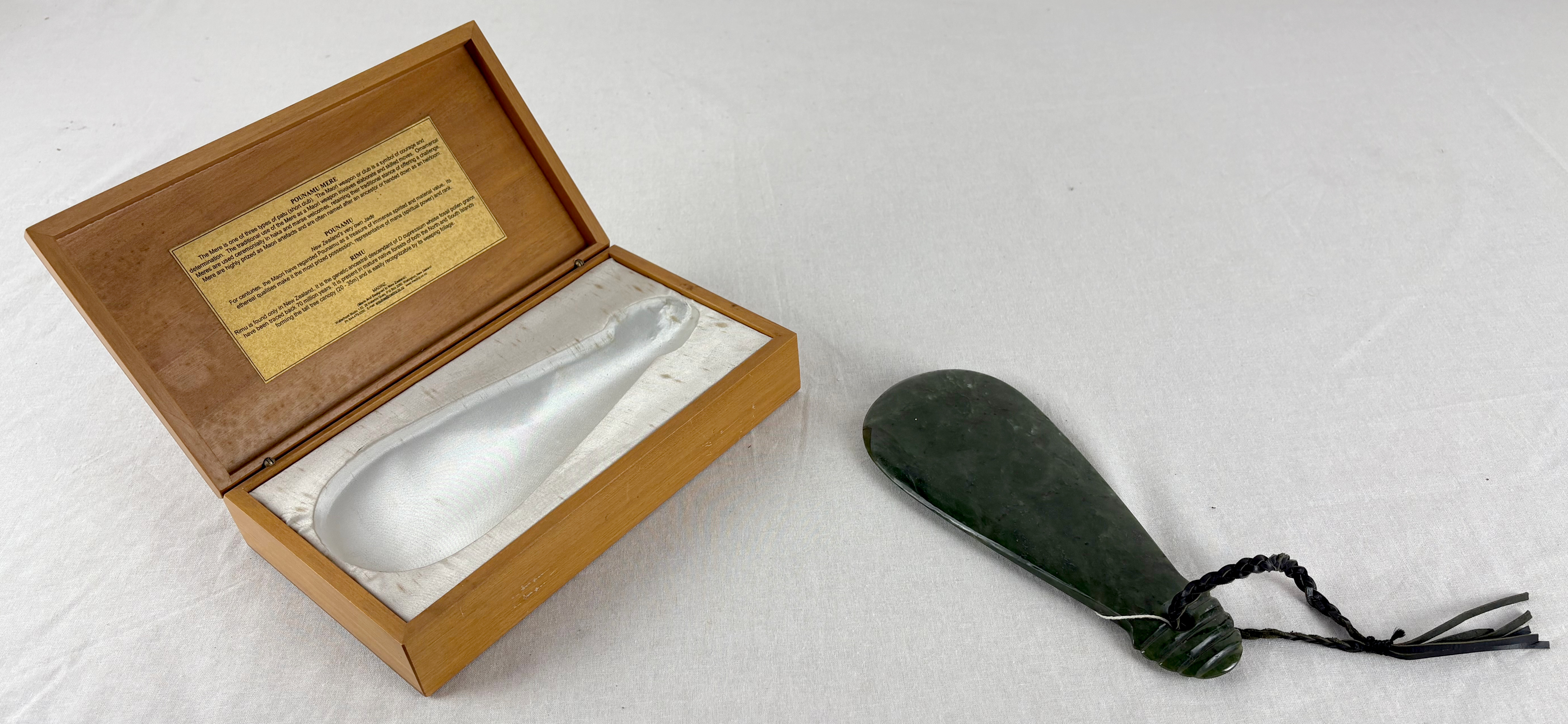Maza de combate utilizada por los maoríes, pueblo indígena de Nueva Zelanda. La palabra patu (escrita dentro del estuche contenedor), en idioma maorí, significa golpear o dominar.